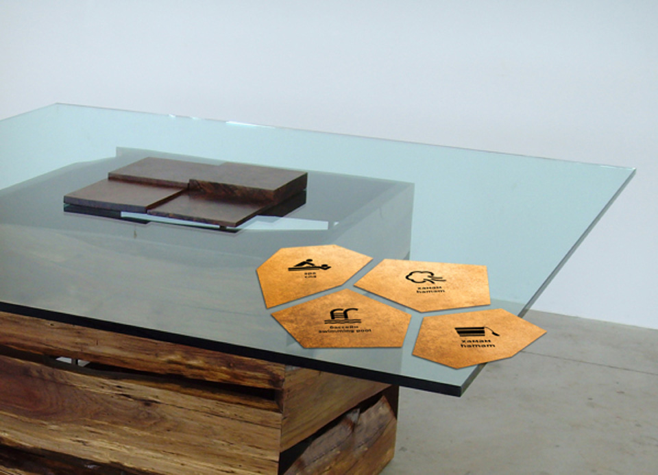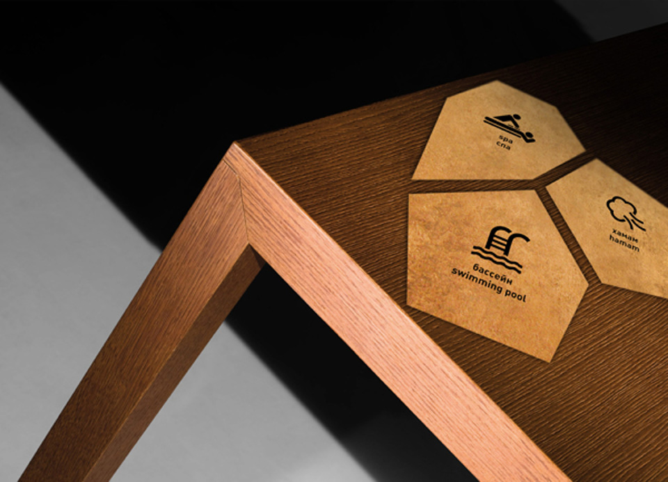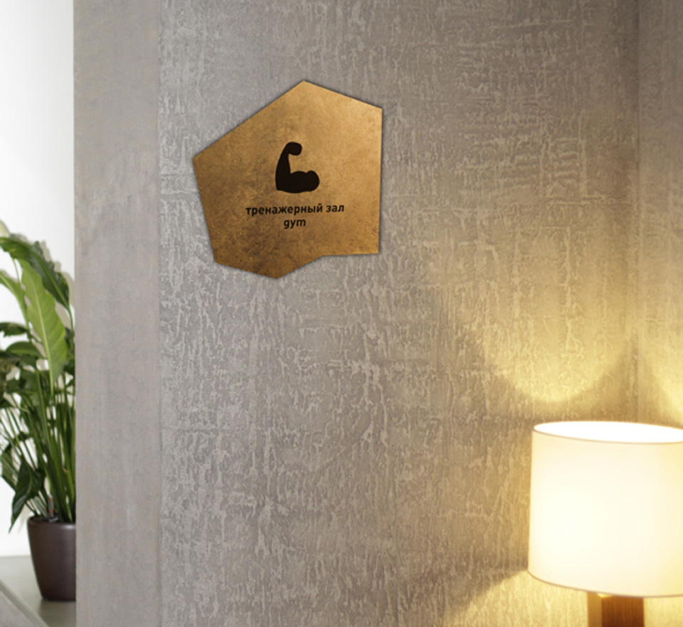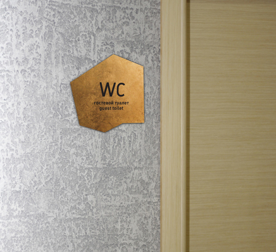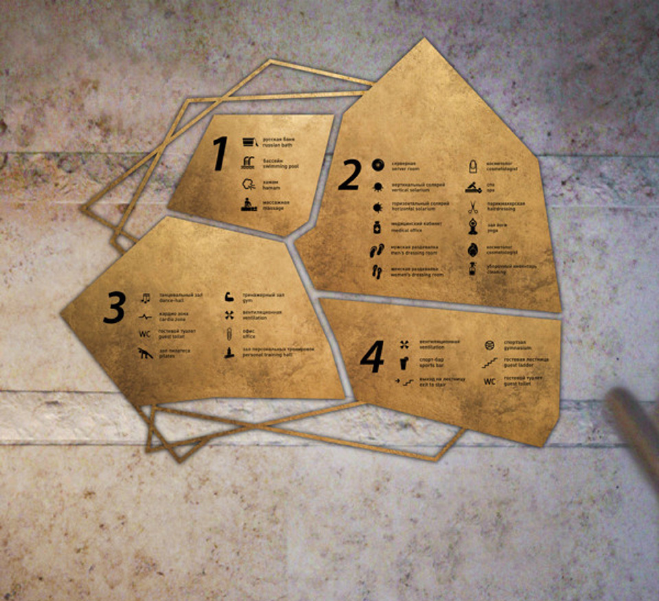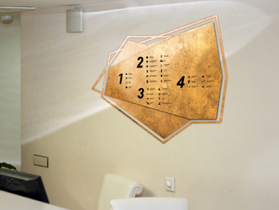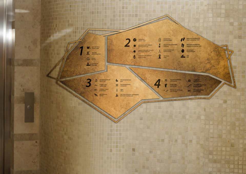 金色是一種材質(zhì)色,一種略深的黃色,是指表面極光滑(鏡面)并呈現(xiàn)金屬質(zhì)感的黃色物體的視覺效果,是高貴、輝煌的象征。在導視系統(tǒng)的設(shè)計中,金色的使用會比較有限,高檔會所是其聚集地,但在造型的選擇中,大多選擇華貴的花紋來襯托金色的華麗。下面這套導視在造型的選擇上卻別出心裁,不規(guī)則的圖形拼合的導視,充滿了古堡與博物館氣息。