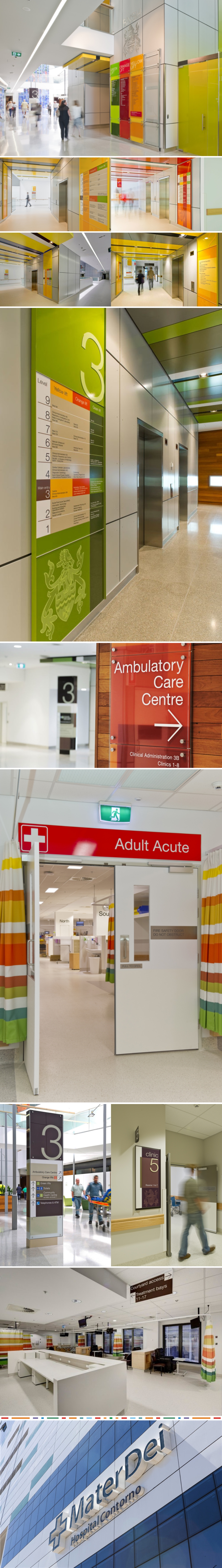 皇家北岸醫(yī)院( RNSH )是澳大利亞領(lǐng)先的研究、創(chuàng)傷和教學(xué)中心之一。也是悉尼大學(xué)悉尼醫(yī)學(xué)院的教學(xué)醫(yī)院。考慮到該醫(yī)院建筑物采用的三種色彩,在導(dǎo)視設(shè)計(jì)中,設(shè)計(jì)師利用這些外部色彩作為主要元素,通過將每種顏色轉(zhuǎn)換到樓層核心位置電梯處的裝飾和信息標(biāo)牌來指引整個(gè)建筑的用戶,并將顏色擴(kuò)展到主要部門和病房地區(qū),不僅有助于用戶找到方向,而且有助于他們記住回程的路線。色彩的使用增強(qiáng)了導(dǎo)視系統(tǒng)的清晰度和直接性,連貫統(tǒng)一的視覺效果避免用戶迷失方向。