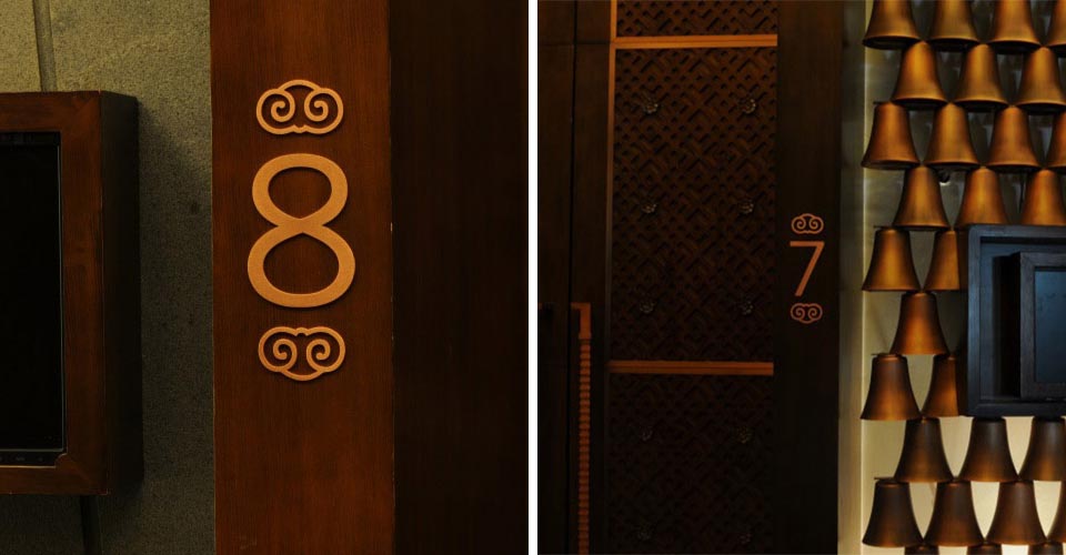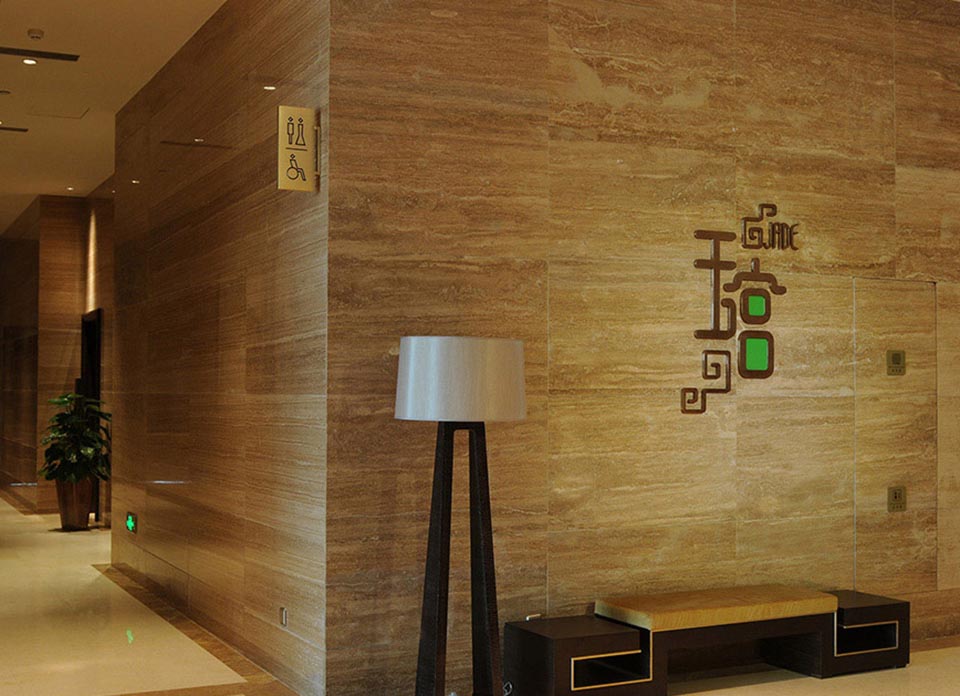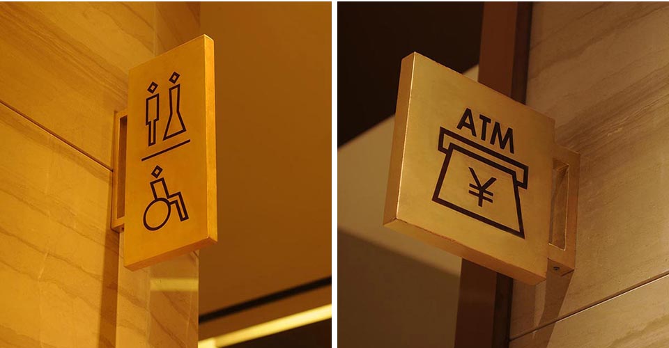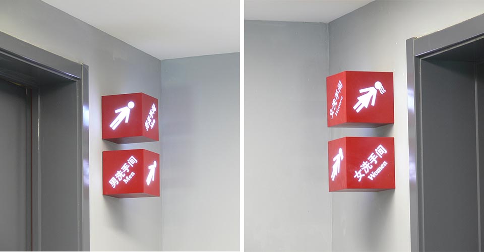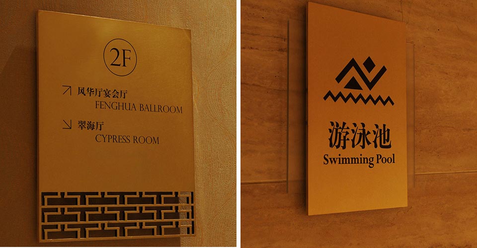 案例四,合肥皇冠假日酒店導(dǎo)視設(shè)計材料上采用不銹鋼噴砂處理,形式上結(jié)合精裝中式窗欞的元素,采用局部鏤空的工藝,總體上簡約、大方、體現(xiàn)現(xiàn)代中式奢華的風(fēng)格。