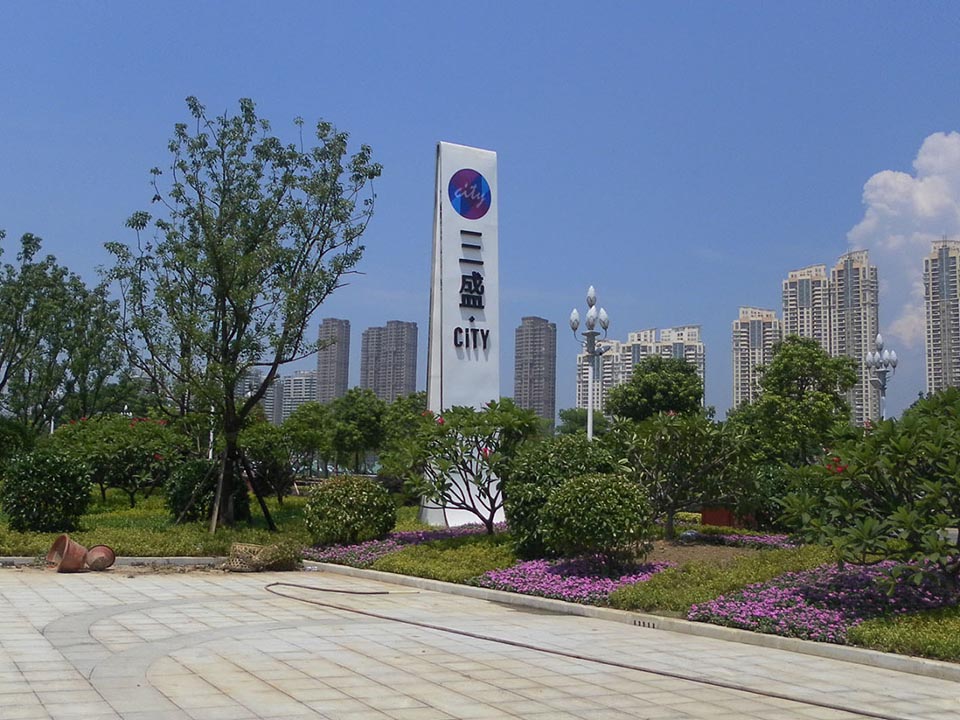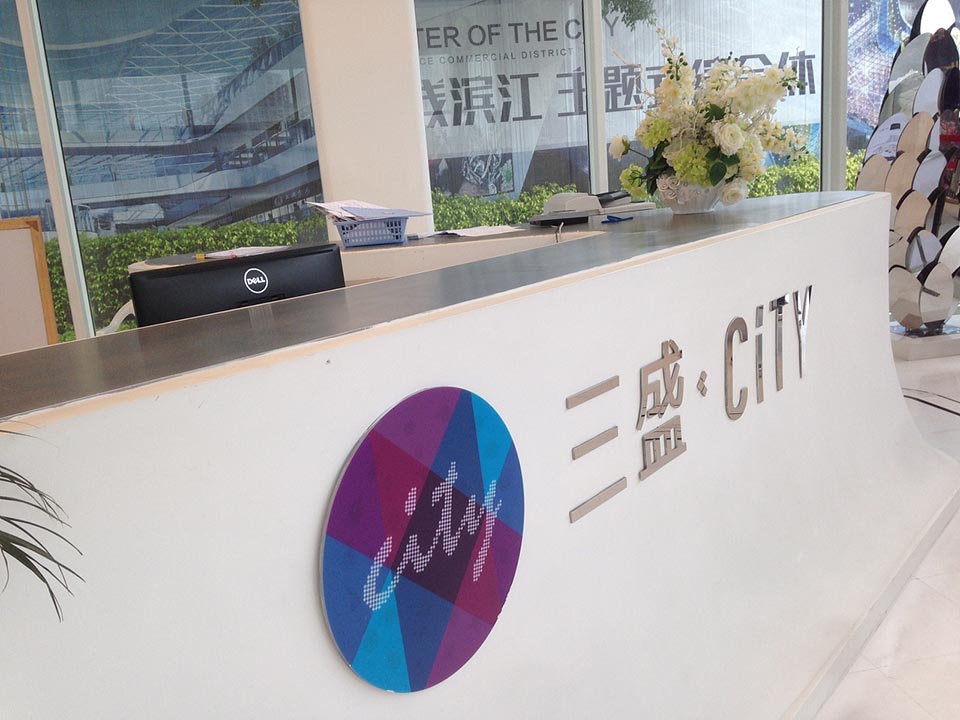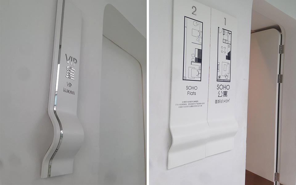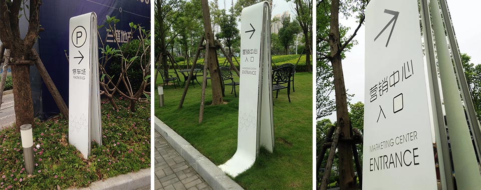 案例三,福州三盛廣場售樓中心導(dǎo)視設(shè)計靈感來源于建筑水流動的概念,標(biāo)識與靈動曲線結(jié)合。